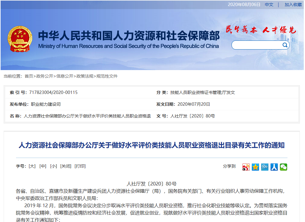 《关于对水平评价类技能人员职业技能退出目录有关安排的公告》。